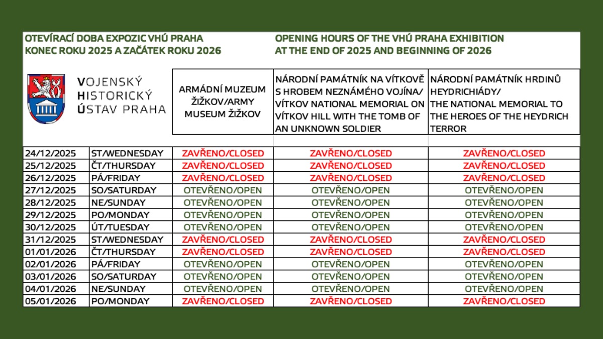 Během vánočních svátků pro vás bude Armádní muzeum Žižkov, stejně jako Národní památník hrdinů heydrichiády a Národní památník na Vítkově s hrobem Neznámého vojína otevřeno. Upravili jsme nicméně návštěvní dobu, konkrétní data s prohlédněte v tabulce níže.
